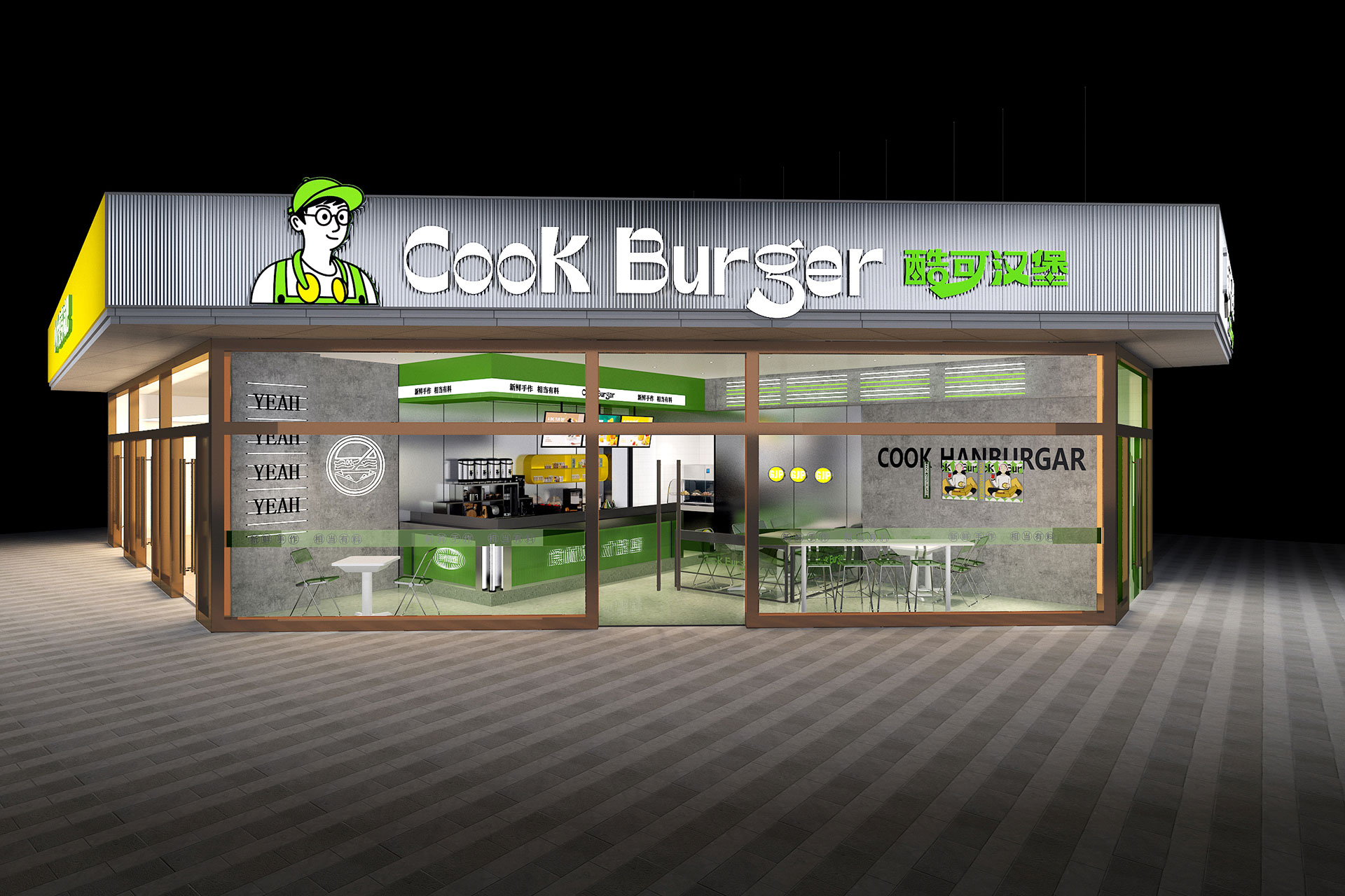 酷可漢堡是一家漢堡餐廳,主打產品全麥漢堡、美味炸雞。酷可名字本身擁有豐富的想象空間,給人潮酷的品牌聯(lián)想。我們設計LOGO時以“酷可漢堡”四個字進行夸張的視覺處理,輔以英文字體,在漢堡的形象上進行延伸。我們融入更多年輕消費者的情緒需求與個性表達,打造品牌IP 形象,通過年輕人“一邊打碟一邊吃漢堡”、“窩在沙發(fā)上聽音樂吃漢堡”等場景演繹,運用動感十足、夸張的插畫表現(xiàn)手法,活潑、動感十足、富有朝氣。