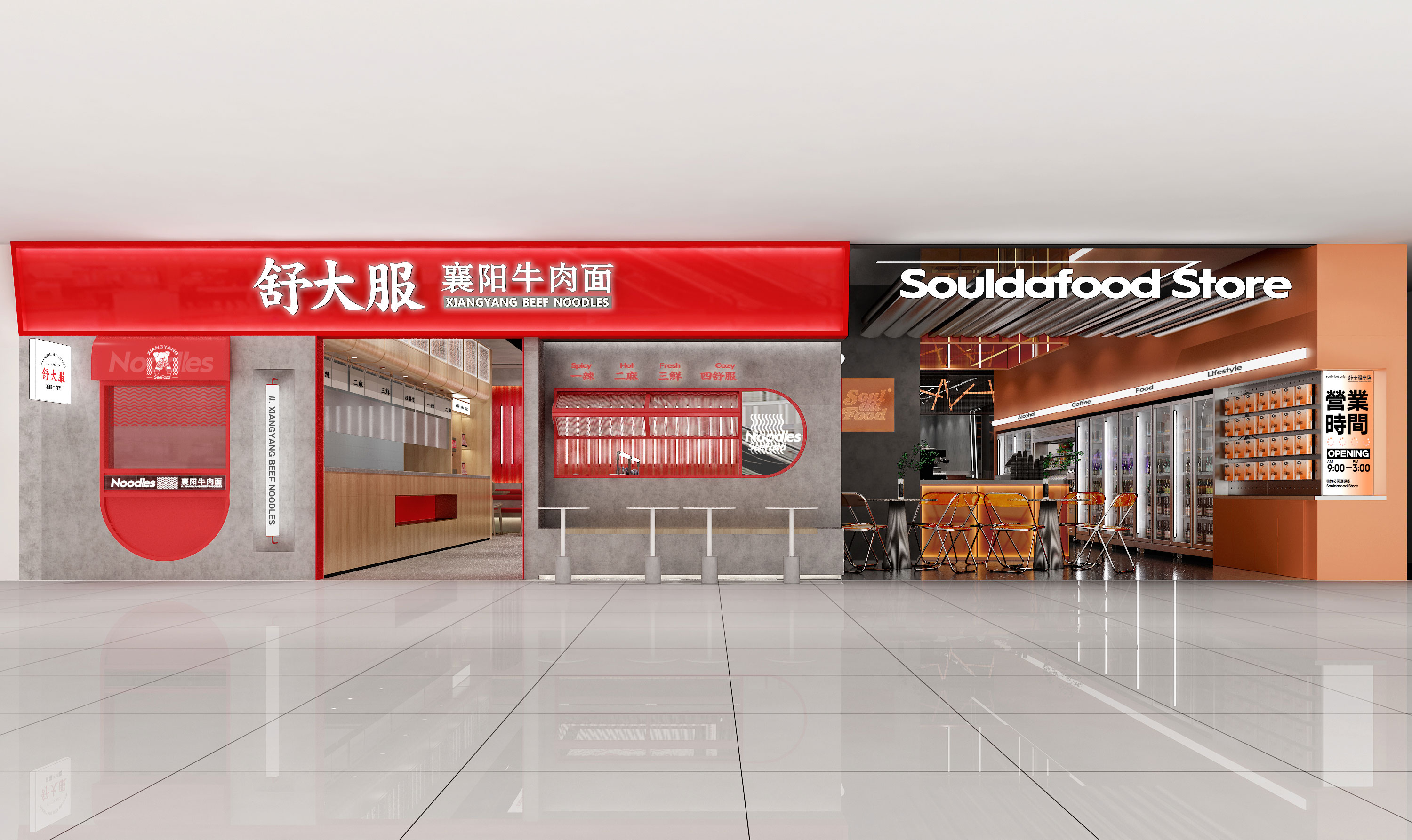 舒大服襄陽牛肉面餐飲店,主營襄陽牛肉面,招呼四方賓客,享用那記憶中的味道??臻g設計采用紅色、黃色、灰色為主色調,用現代的表現手法詮釋傳統面食文化??臻g中的IP人物形象成為整個空間的一大亮點,墻面的IP與天花板遙相呼應,使得整個餐飲空間活潑而又靈動。”一麻、二辣、三舒服“的產品賣點赫然入目,面形波浪紋貫穿空間視覺始終。木質調的桌椅與大膽跳脫的空間裝飾,悄然共生,讓顧客在輕松明快的氛圍中享受美食